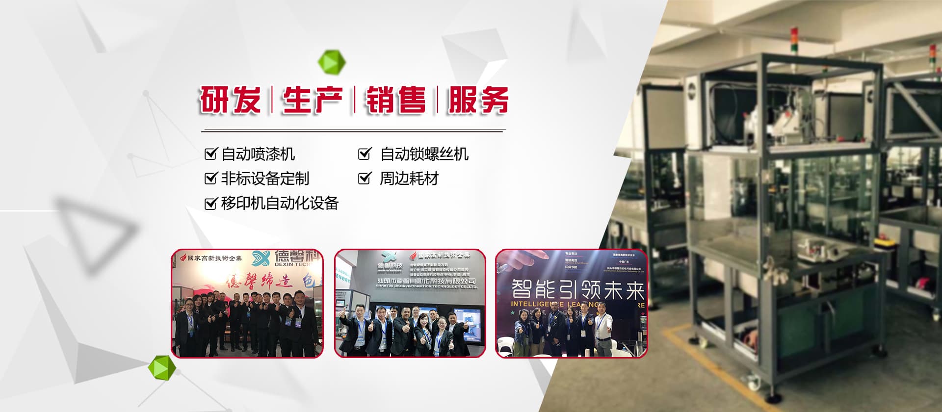 德馨科技創立以來,以改變噴印業傳統手工生產模式為目標,產品開發制造堅持以“環保、智能”為理念,為企業的生產環境、人力成本、生產效率等提供更為優良的服務和技術支持。公司研發產品主要有自動化噴漆機械、噴漆模具制作等;生產銷售移印機械及移印相關耗材,包括菲林設計輸出;鋼板制作、移印膠頭制作、定位制作及周邊配件耗材并提供完善的售后服務支持。